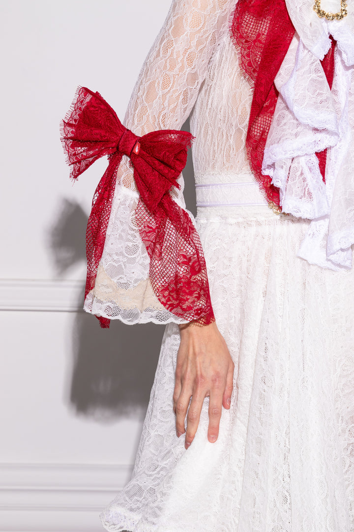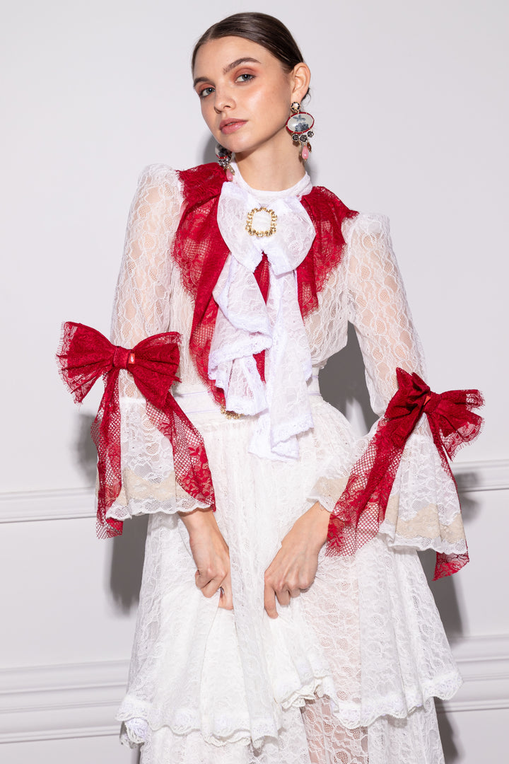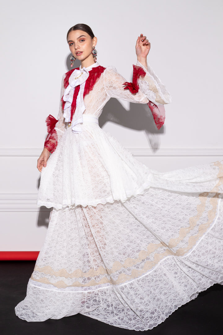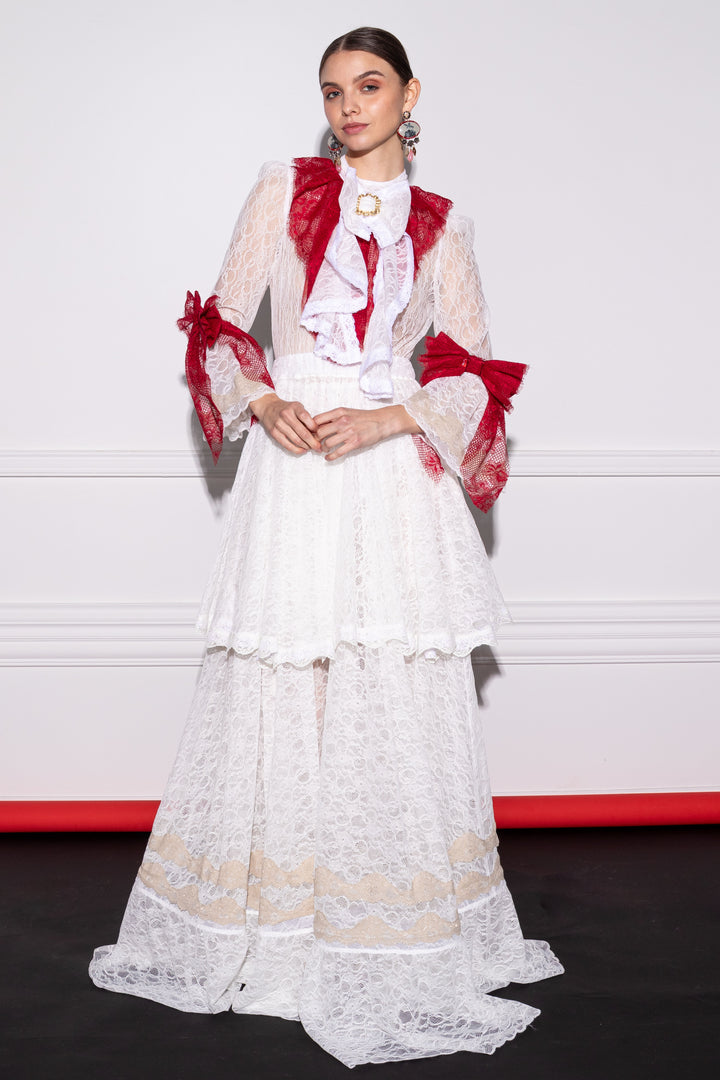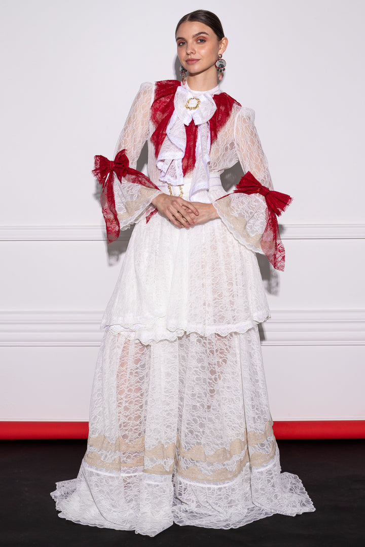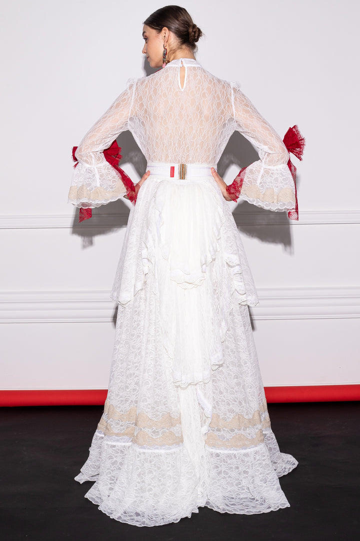 Maxi hosszúságú, hosszú ujjú, laza fazonú csipke ruha. Zárt, kerek nyakát pánt szegi, amely a háta egy hasíték felett gombokkal záródik. Elején piros csipke zsabó és arany díszes övcsattal ellátott masni, ujjainak fodor részén piros masni díszíti. Alját fodor szegi, felette csipke kellékek futnak. Derekára egy külön álló, levehető rátét is készült, amelyet hátul hajtások formáznak.