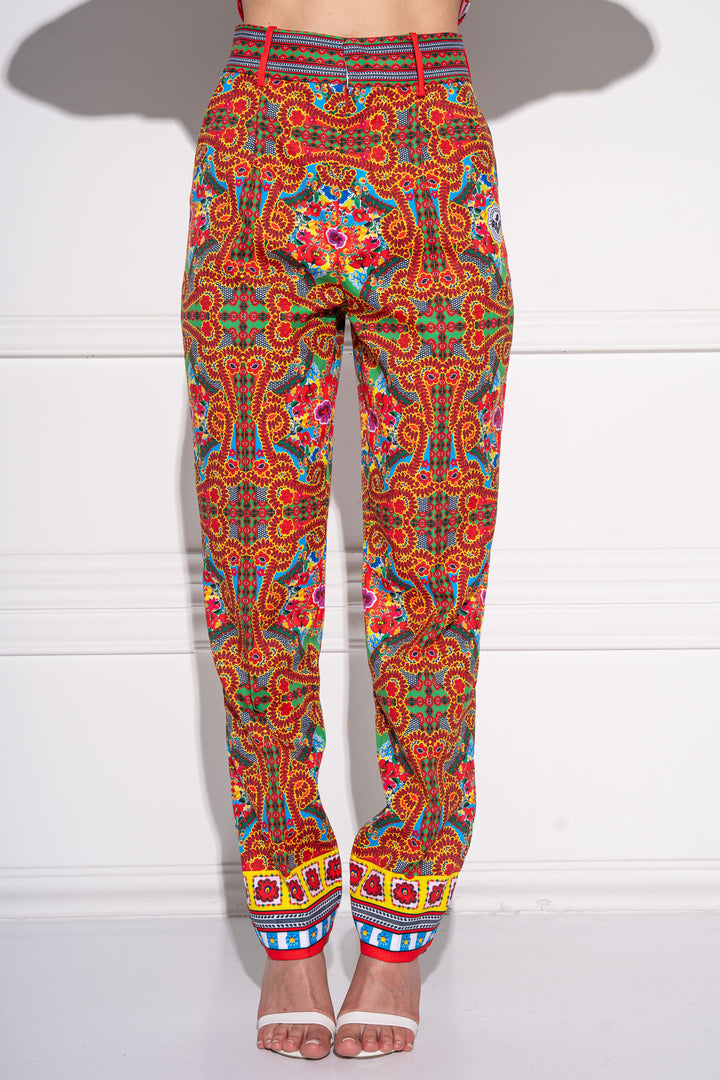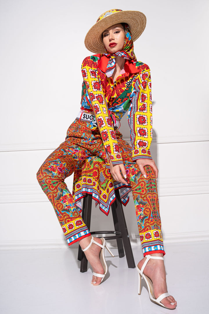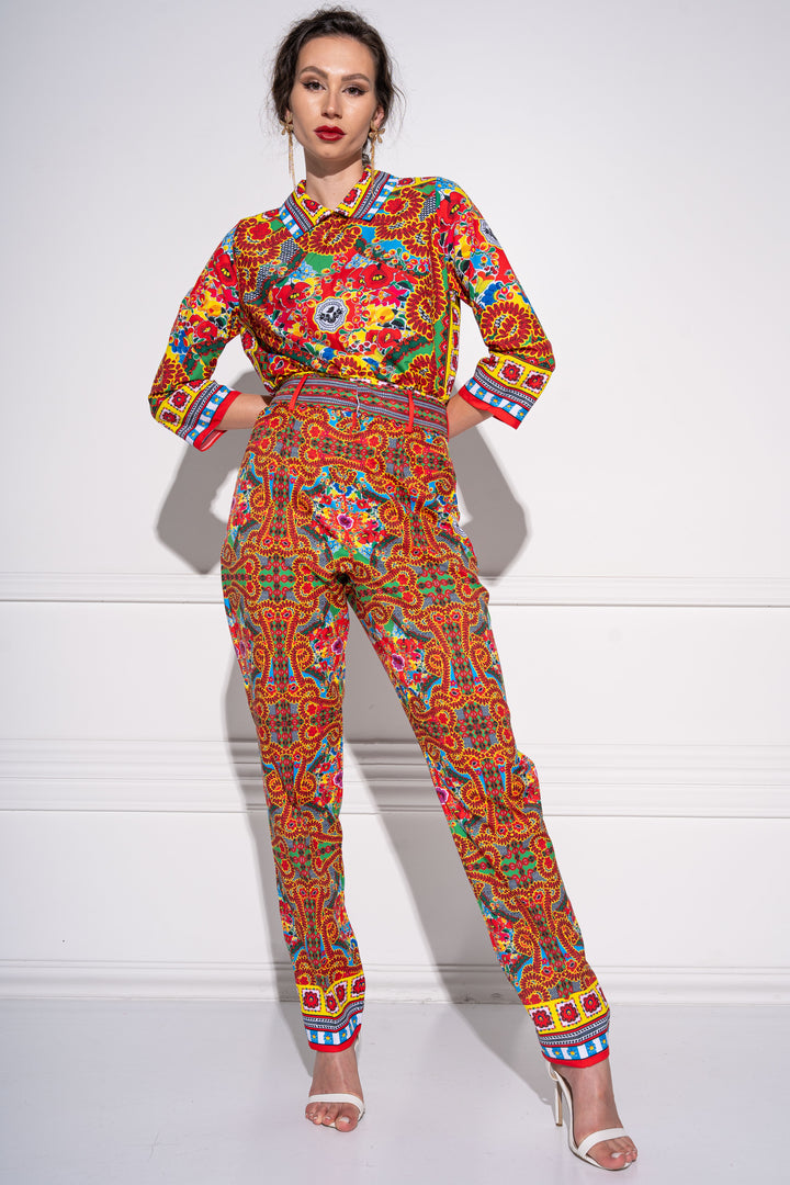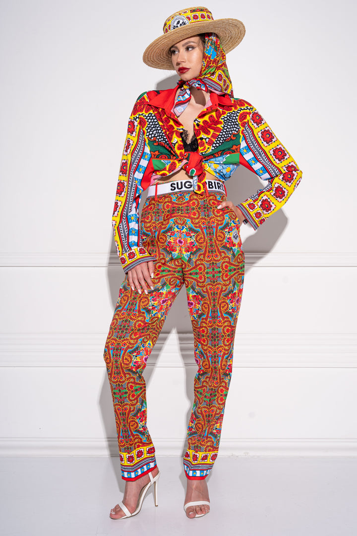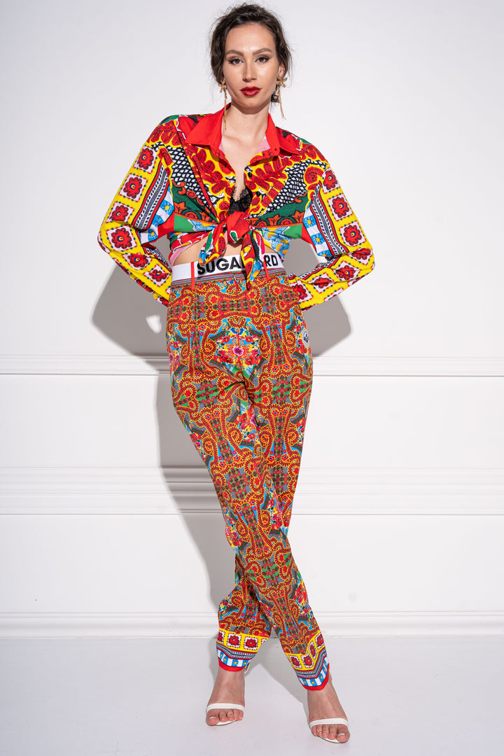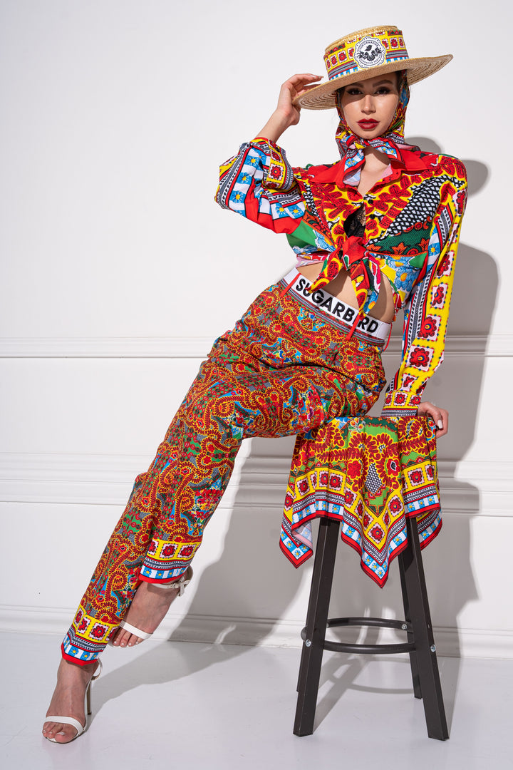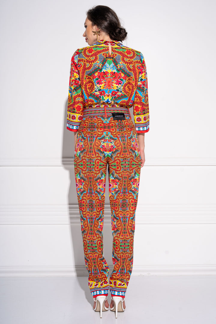 Capri hosszúságú, svédzsebes deréknadrág. Elején zipzáras hasítékkal és gombokkal záródik. A nadrág hátán szűkítők formázzák és a szárakon él vasalás díszíti. Derekára övtartókat, hátára SUGARBIRD feliratú címkét helyeztünk.
