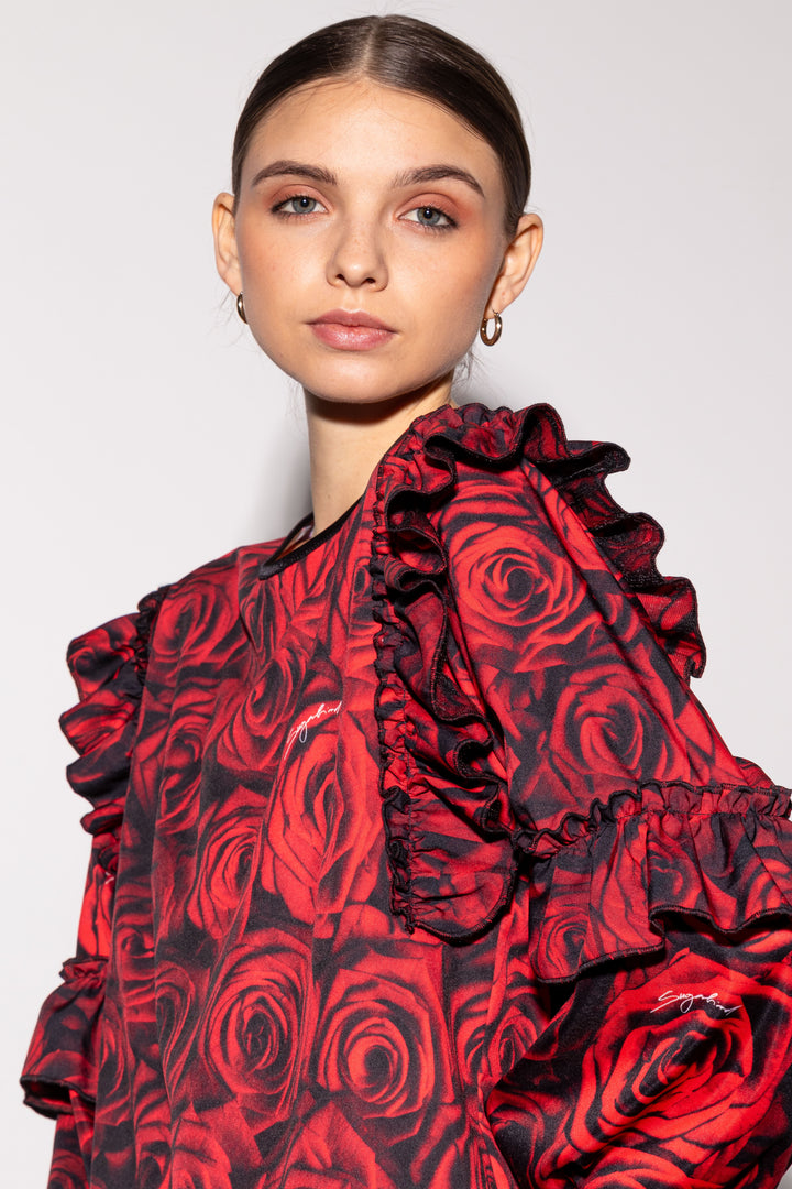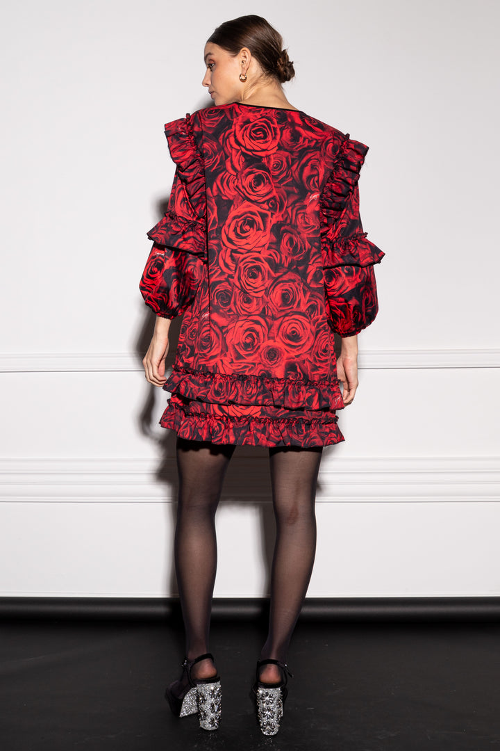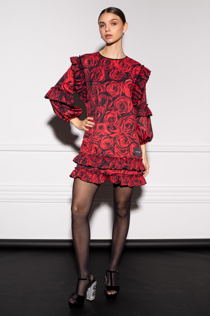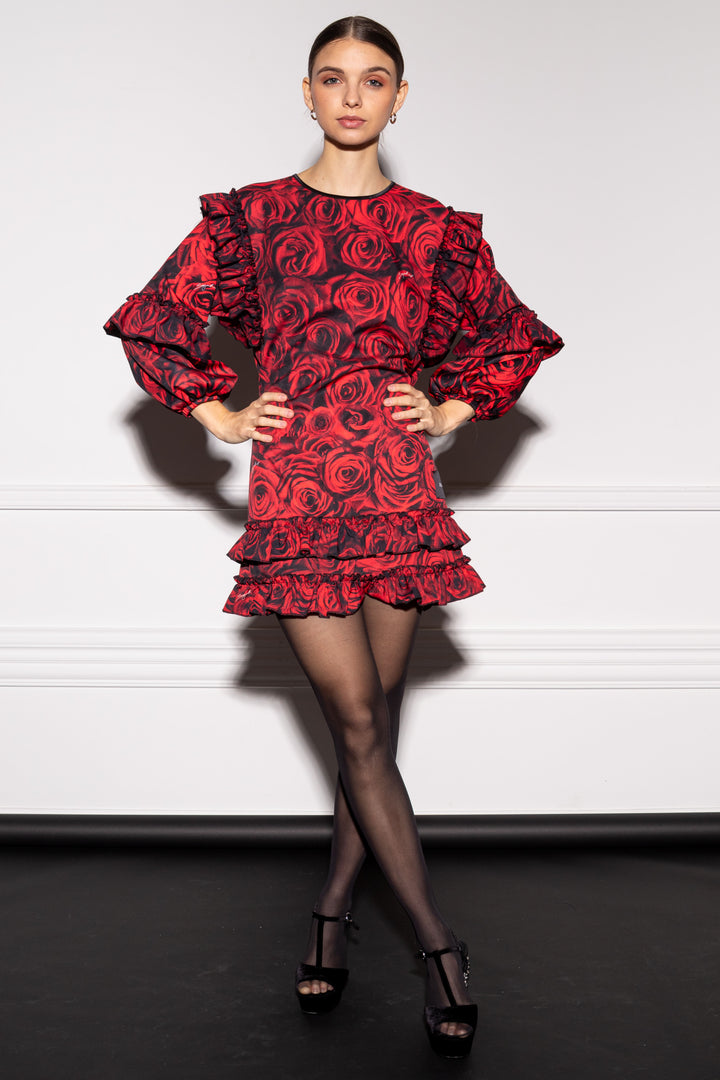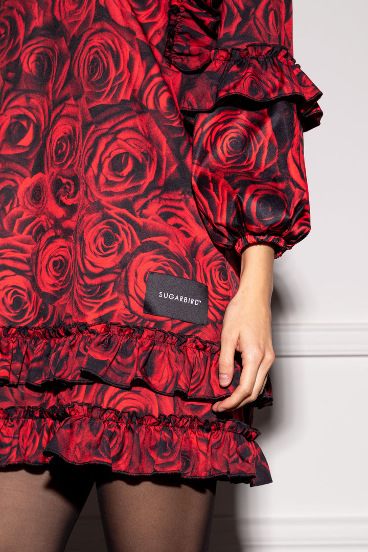 Hosszú és puffos ujjú, combközépig érő, laza fazonú ruha. Ujja, válla és az eleje szabásvonalakban, valamint a szoknyarész alján húzott fodor díszíti. Ujja alja gumizott, zárt, kerek nyakát keskeny pánt szegi. Elejére SUGARBIRD feliratú címkét varrtunk.