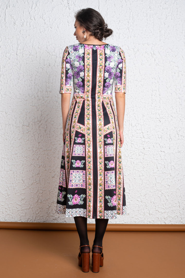 Vádliközép hosszúságú, háromnegyedes ujjú, felső részén alak követő, szoknya részén bővülő „A” vonalú ruha. Mélyen és ívesen kivágott nyakköre keskeny pánttal szegett. Ujjára SUGARBIRD feliratú címkét varrtunk.