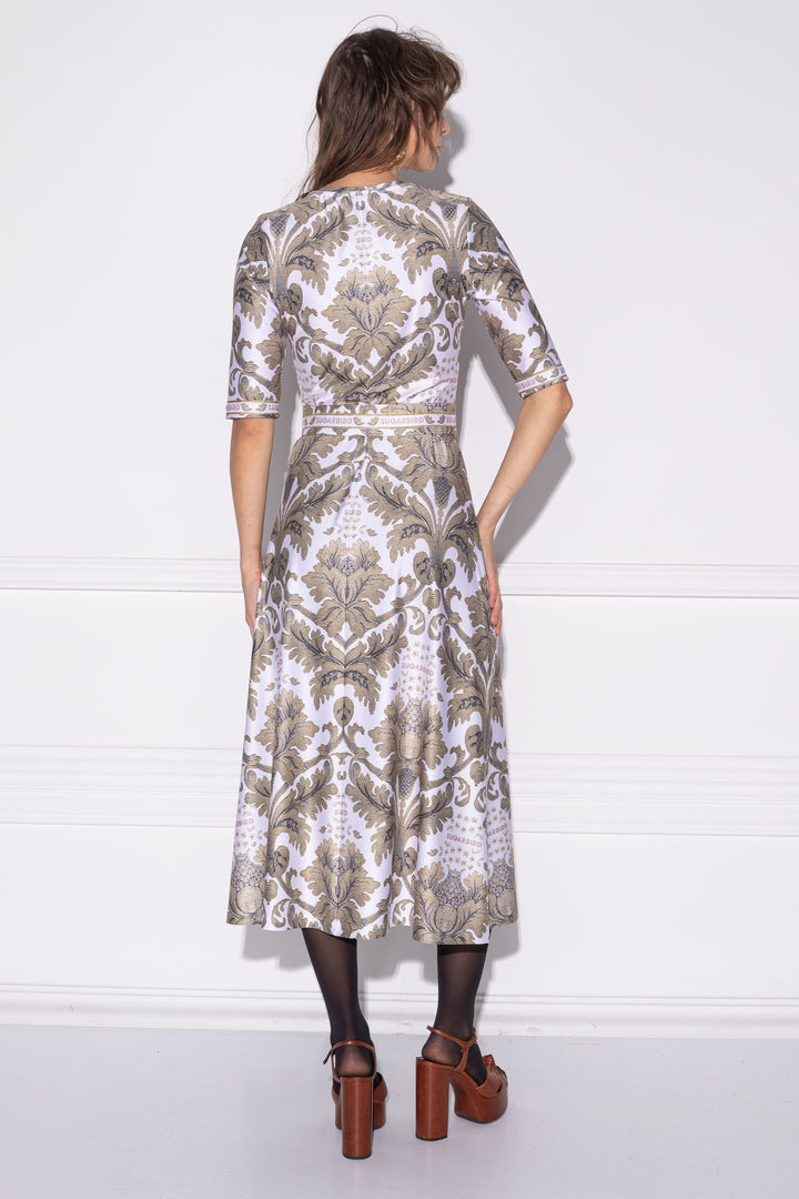 Háromnegyedes ujjú, vádliközép hosszúságú, alak követő ruha. Zárt kerek nyaka félbehajtott pánttal szegett. Szoknya része bővülő „A” vonalú.