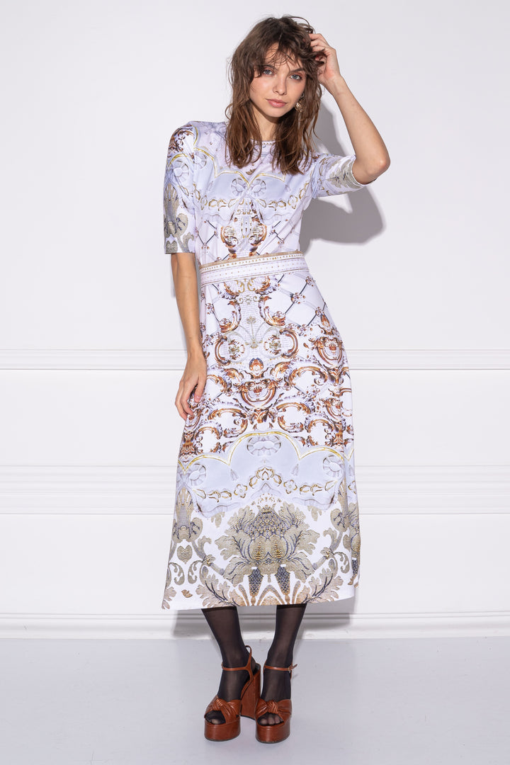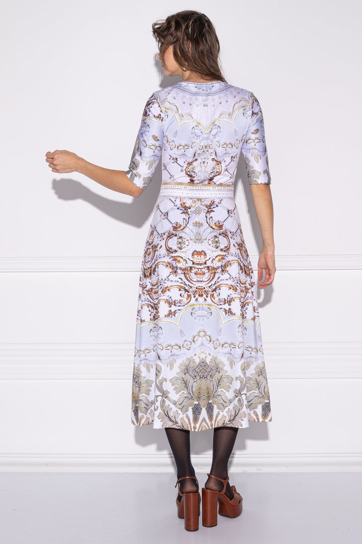 Háromnegyedes ujjú, vádliközép hosszúságú, alak követő ruha. Zárt kerek nyaka félbehajtott pánttal szegett. Szoknya része bővülő „A” vonalú.