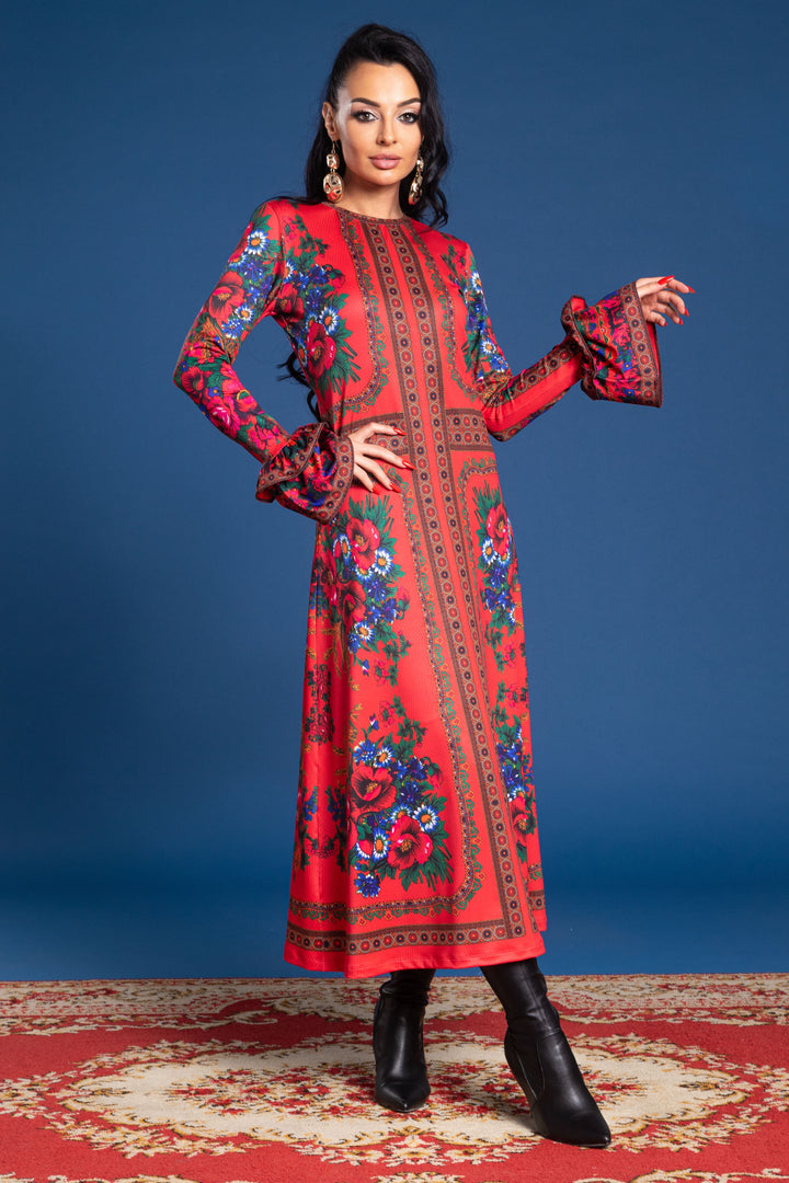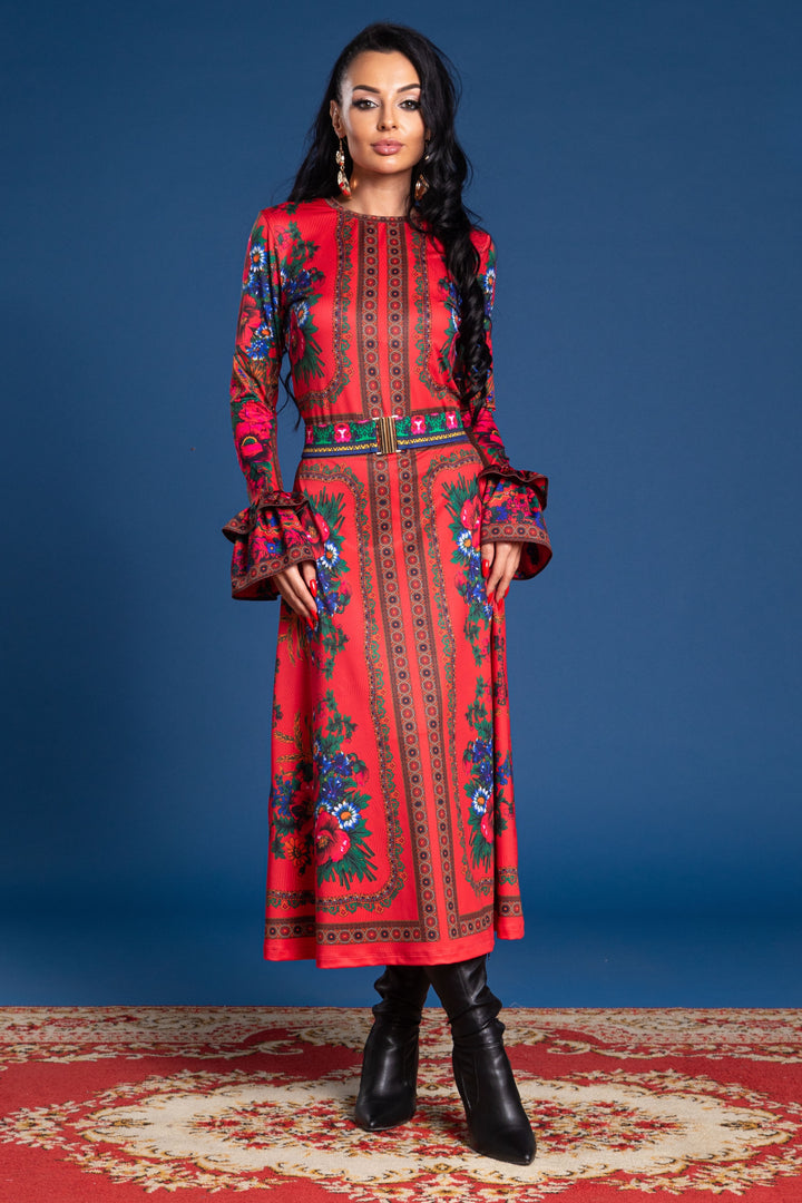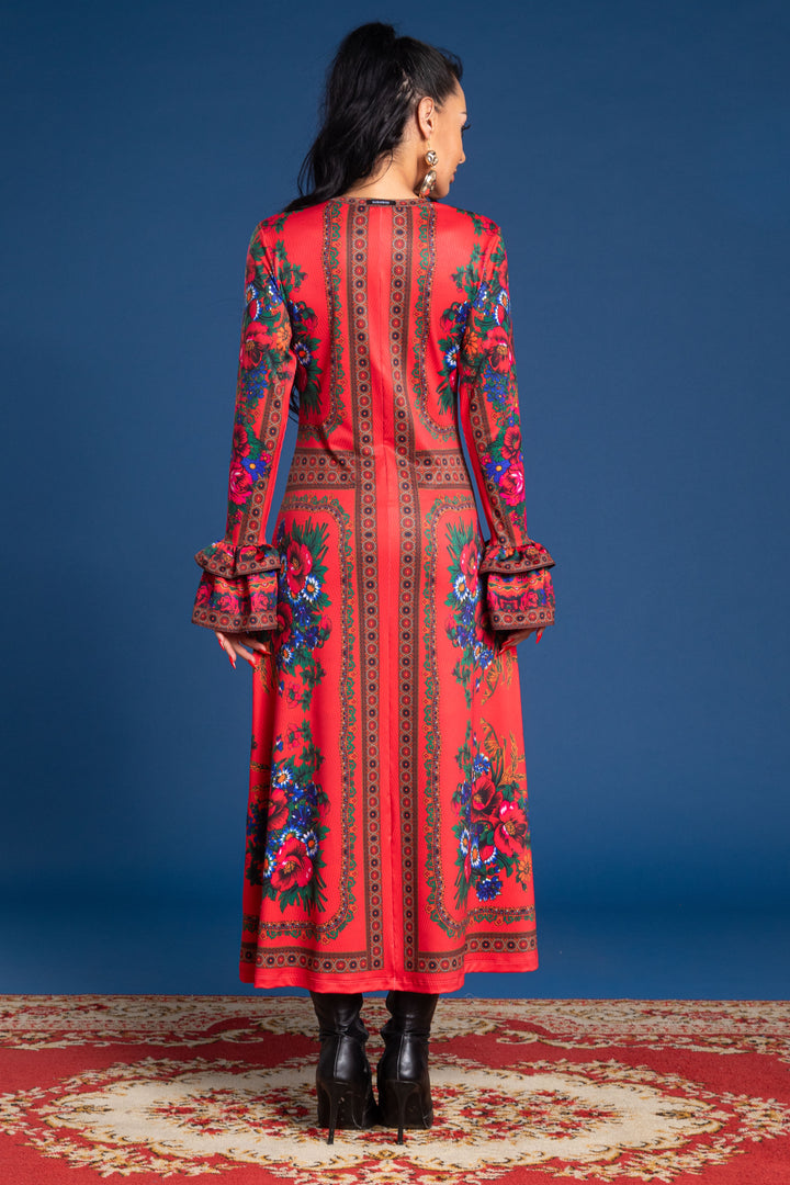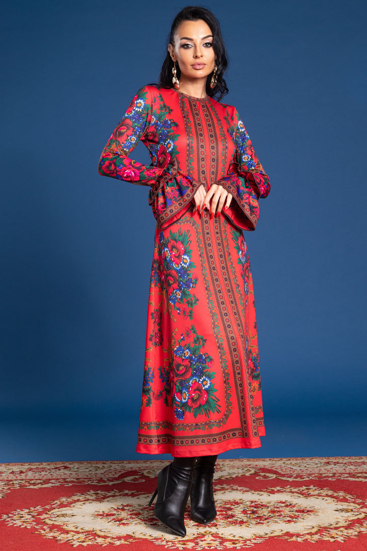 Hosszú ujjú, vádliközép hosszúságú, alak követő ruha. Zárt kerek nyaka félbehajtott pánttal szegett. Szoknya része bővülő „A” vonalú. Ujja alját húzott fodrok díszítik. Hátára SUGARBIRD feliratú címkét varrtunk.