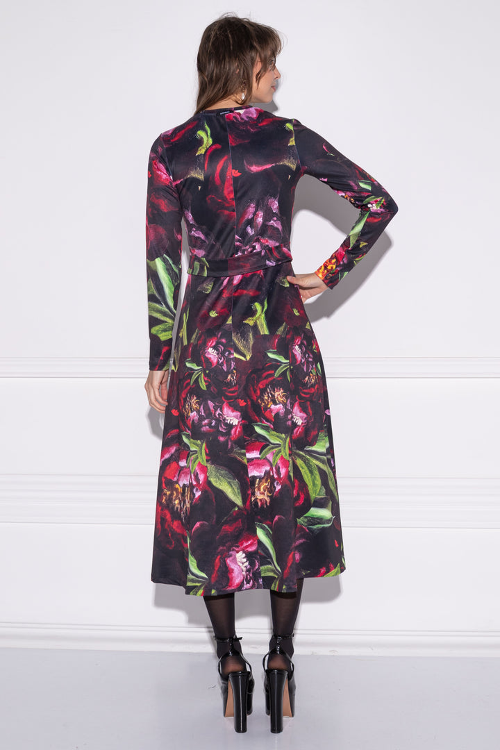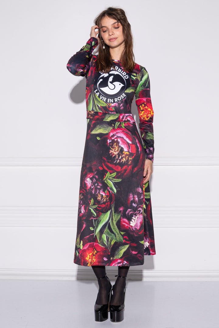 Hosszú ujjú, vádliközép hosszúságú, alak követő ruha. Zárt kerek nyaka félbehajtott pánttal szegett. Szoknya része bővülő „A” vonalú. Derekán övpánt díszíti. Hátára SUGARBIRD feliratú címkét varrtunk.