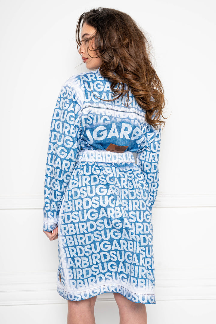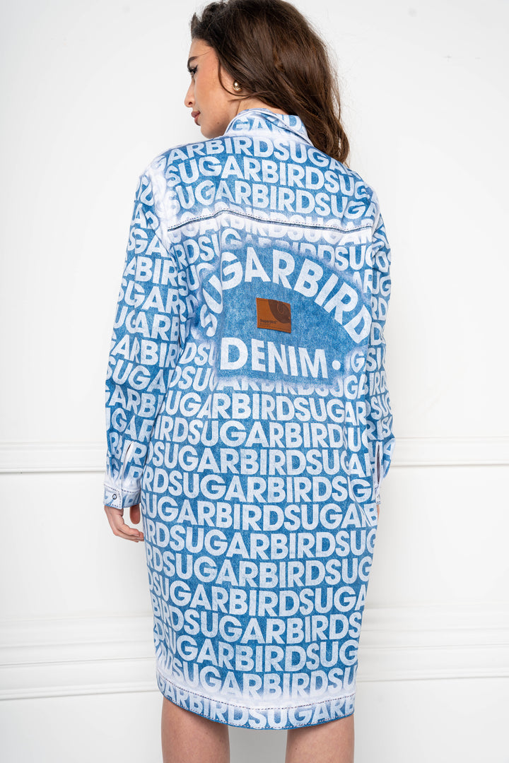 Térd feletti hosszúságú, hosszú ujjú, egyenes és laza fazonú ingruha. Nyakát széles gallér szegi. Eleje közepén és a kézelőn patentokkal nyitható. A ruhához egy külön álló gumis öv is készült, amely ezüst színű övcsattal záródik. Elején és hátán SUGARBIRD feliratú, bőr címkék díszítik.