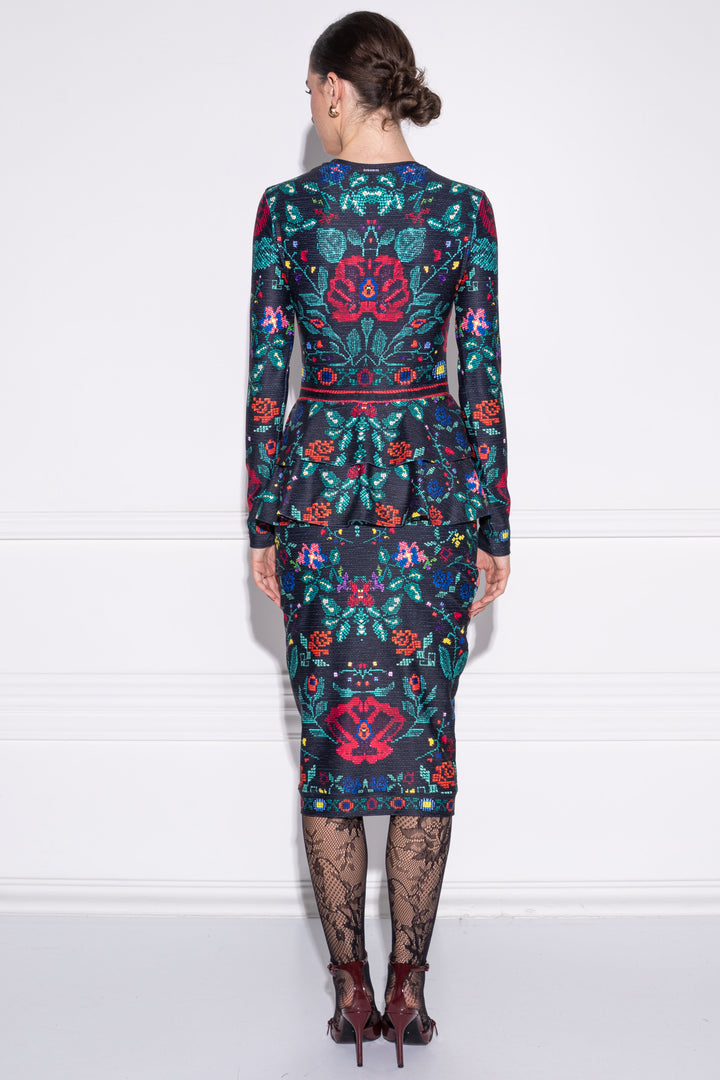 Hosszú ujjú, alak követő, térd alatti hosszúságú ruha. Kerek nyakköre keskeny, félbe hajtott pánttal szegett. Derekát dupla és széles fodrok díszítik. Hátára SUGARBIRD feliratú címkét varrtunk.
