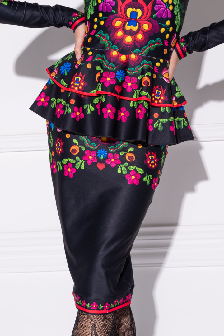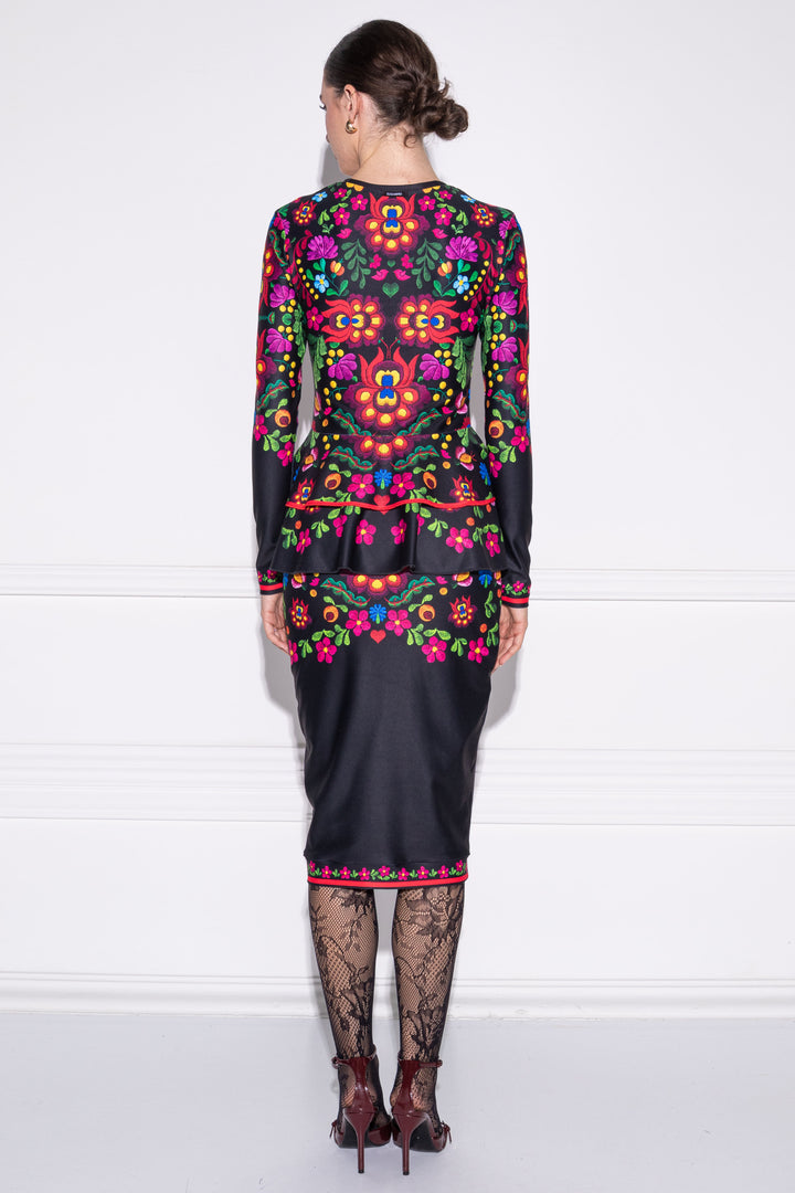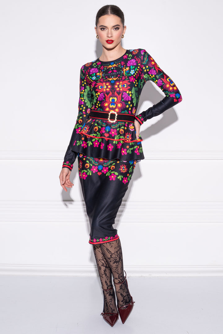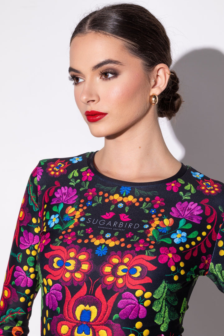 Hosszú ujjú, alak követő, térd alatti hosszúságú ruha. Kerek nyakköre keskeny, félbe hajtott pánttal szegett. Derekát dupla és széles fodrok díszítik. Hátára SUGARBIRD feliratú címkét varrtunk.