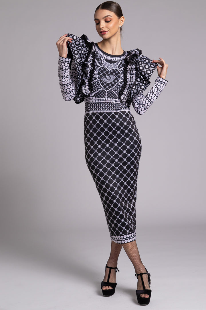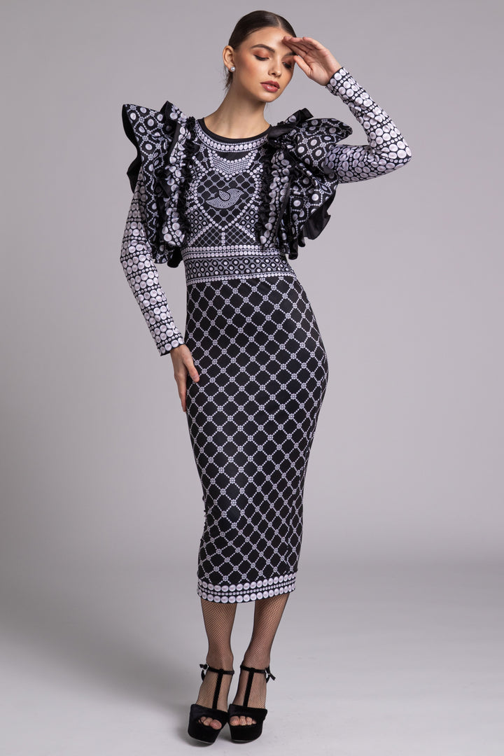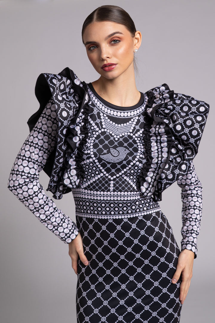 Hosszú ujjú, vádliközép hosszúságú, alak követő ruha. Zárt kerek nyaka keskeny, alja félbe hajtott pánttal szegett. Vállain széles és húzott fodrok futnak. Hátán fehér masnis kellék és SUGARBIRD feliratú címke díszíti.