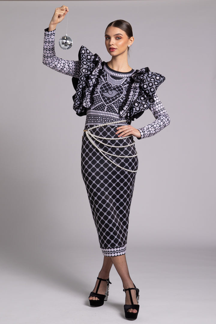 Engedd, hogy elvarázsoljanak az ünnepi gyöngyök és az ünnepi csillogás egy limitált kollekciónk keretében, melynek mintáját fekete alapon, gyöngy motívumokkal printelt minták díszítik.