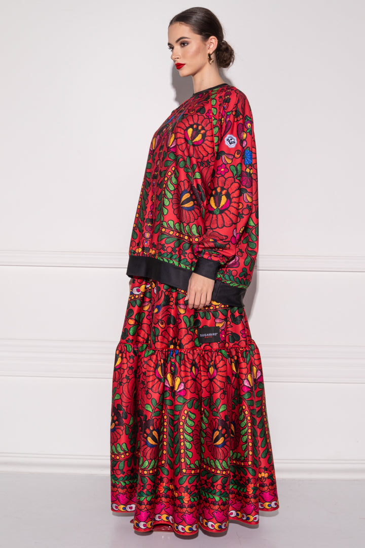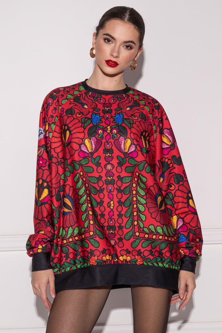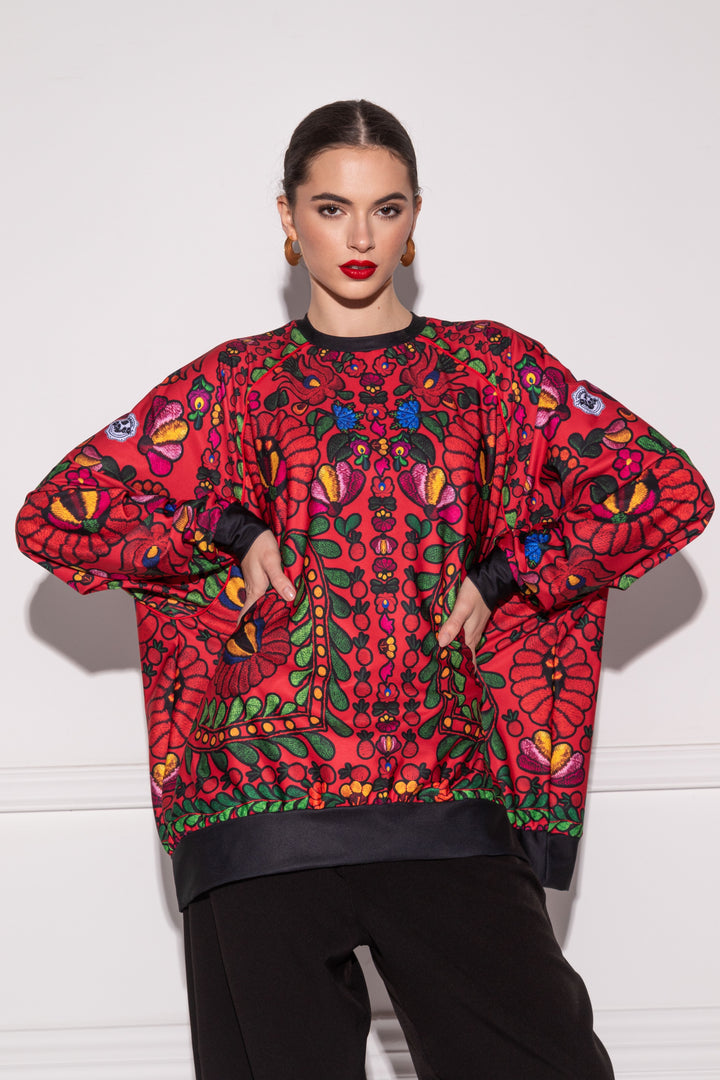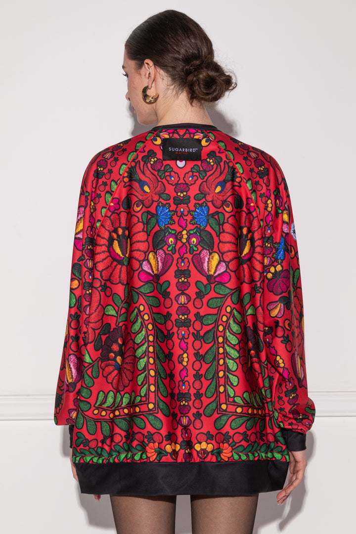 Hosszú ujjú, raglán szabású, csípő alá érő, bő fazonú pulóver. Kerek, zárt nyaka, alja és ujja alja félbehajtott pántokkal szegett. Szabásvonalait paszpól díszíti. Hátára SUGARBIRD MATYÓ feliratú címkét varrtunk.